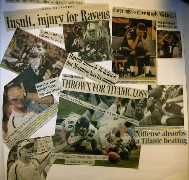 I was in my previous department and was surrounded by a lot of Ravens fans. When the Ratbirds opened the season with a couple of losses, I decided to make a collage out of the press clippings. I figured I’d do it for a few weeks and have a little fun with my purple-clad co-workers. It started out like this: